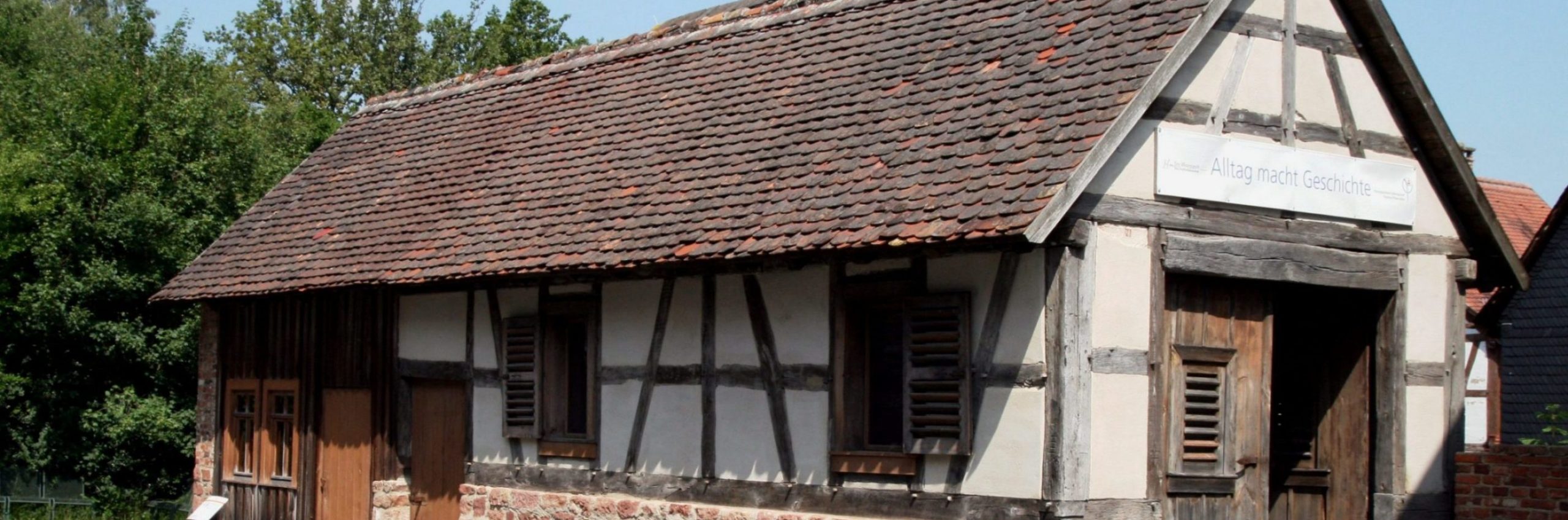 Im Innenraum ist die kleine Ausstellung „Feuer und Flamme“  zu sehen. Sie rückt die Brandbekämpfung in den Fokus und macht die Geschichte der Feuerwehr am Beispiel der Hausgeschichte des ehemaligen Feuerwehrgerätehauses aus Hainstadt sichtbar.