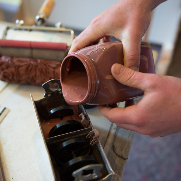 Maler beim Einfüllen von Farbe in das Rollgerät der Musterwalze