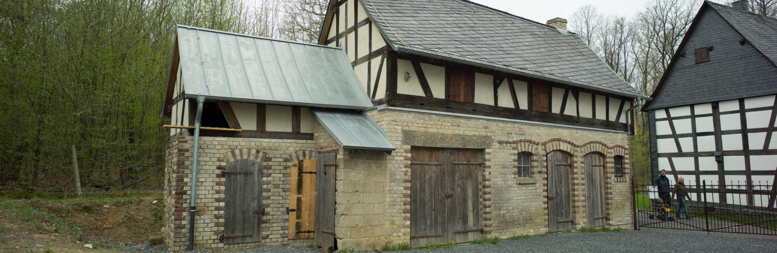 This outbuilding, which has undergone several alterations, features a timber-frame knee wall incorporating some re-used timber. It was probably used as a stable originally. A smaller stable building, visibly offset, adjoins the larger structure. In about 1890, the ground floor was given cinder-and-sand-lime brick walls which had been produced in the Buderus family ironworks in Burgsolms using the residue from blast furnaces. Red burnt bricks were used as decorative elements. The recessed ground floor wall on the gable side is the result of a condition issued by the building authorities, as the stipulated distance to the road had not been kept to previously. In about 1905, a master blacksmith moved the smithy from the living quarters in the residential building into the outbuilding. Subsequently, a privy lean-to was attached. The part of the stable next to the horse boxes was given a double door and served as a garage for the village teacher’s car in the 1920s. After the Second World War at the latest, all uses connected to animal husbandry and the blacksmith’s craft were given up. Only the last owner’s horse was stabled here into the 1960s.