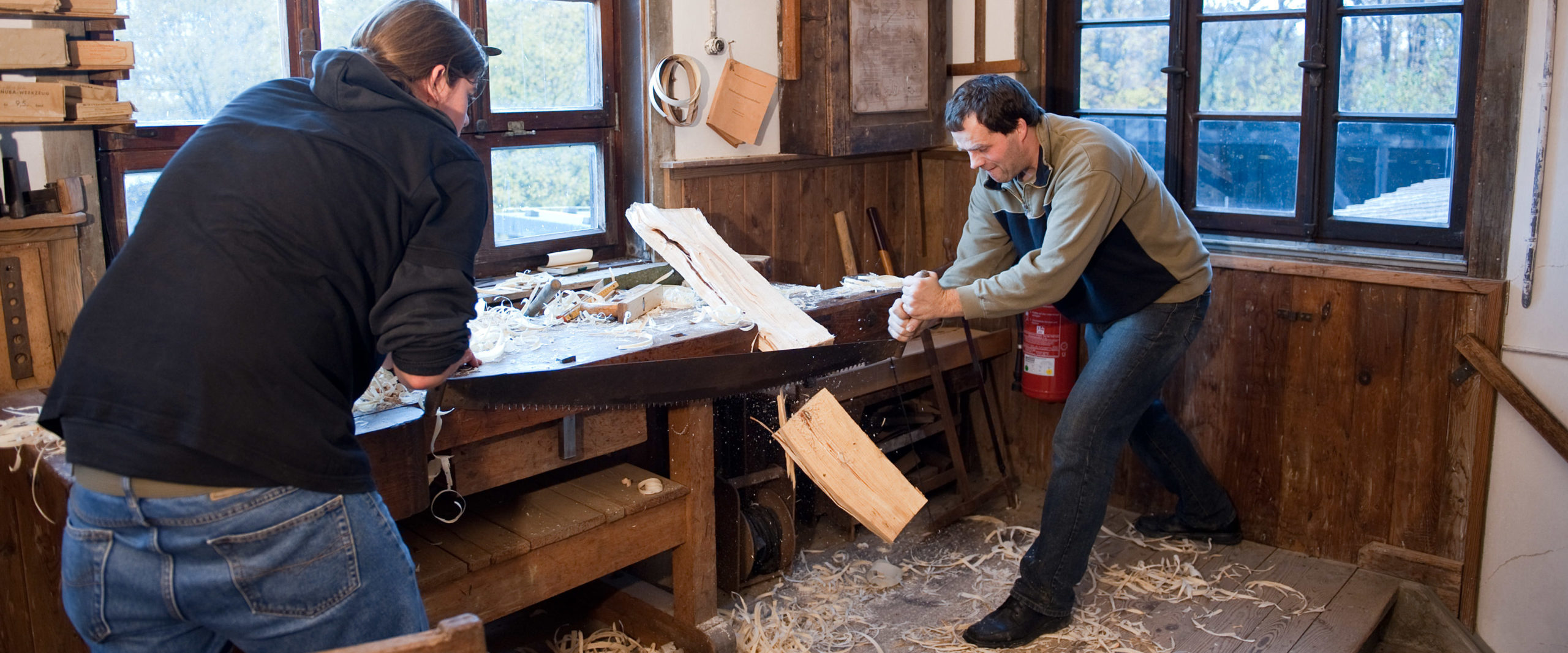 Mitarbeiter beim Hobeln in der Schreinerei - Nahaufnahme