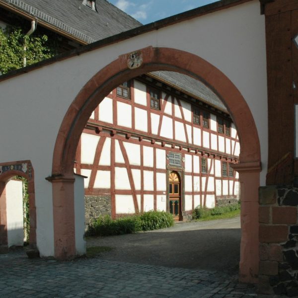 Das ehemalige Amtshaus der Stadt Hungen im heutigen Kreis Gießen ist mit seinem am Straßengiebel vorkragenden Erker, wegen der imposanten Größe und seines reichen, mit farbig gefassten Schnitzereien versehenen Sichtfachwerks eines der schmuckvollsten und zugleich ältesten Profangebäude im Freilichtmuseum. An den Straßengiebel schließt sich rechts eine Pforte mit einem Stichbogen aus Sandstein an. An dieser Stelle wurden die Jahreszahl 1589 und zwei Wappen eingemeißelt. Am alten Standort war das Verwaltungs- und Wohnhaus Teil einer Hofanlage, zu der unter anderem auch eine Zehntscheune zur Einlagerung der bäuerlichen Abgaben an die Landesherren gehörte.