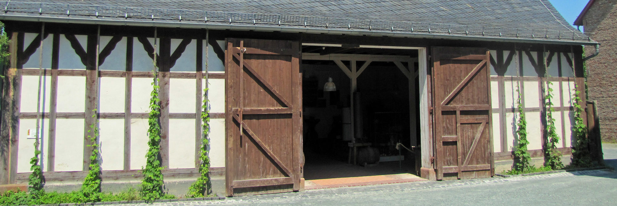Das Original der Schmuckfachwerkscheune aus Hadamar stammte aus dem 17. Jahrhundert und war Teil des barocken Fohlenhofes des Marstalls und Schlosses der Grafen von Nassau-Hadamar. Das Gebäude musste im Zuge einer Umnutzung des Geländes Mitte der 1970er-Jahre einer Neubaumaßnahme in der Gymnasiumstraße weichen. Zu diesem Zeitpunkt konnte es noch durch das Freilichtmuseum aufgemessen werden, ein kontrollierter Abbau war jedoch nicht mehr möglich. Deshalb wurde die Scheune 1991 auf Basis der bestehenden Baupläne im Freilichtmuseum rekonstruiert. Seither wird sie als Ausstellungsgebäude genutzt.