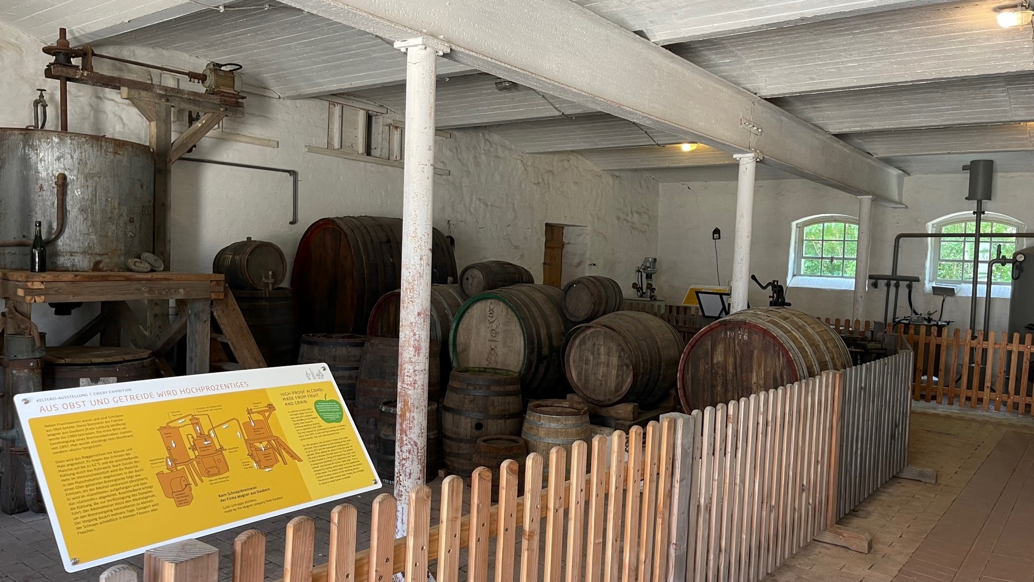 The newly reworked cider press exhibition explains how apples are turned into Äbbelwoi and apple juice. Information panels illustrate the process from cleaning, crushing, pressing and fermenting to bottling. Various apple mills and cider presses can be admired as well as a historical pasteurisation plant from Bad Homburg and the 1950s “Polfram” bottle washer. In addition to the information panels on numerous trees and the fruit tree pruning trail in the grounds of the open-air museum, the exhibition is a further contribution to the theme of fruit growing and orchards. It complements the annual cider press demonstrations.