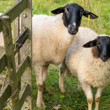 Zwei Rhönschafe stehen neben einem Gatter auf der Weide und blicken in die Kamera.