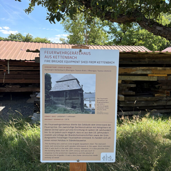 To provide interested visitors with background information on the history and significance of the “sleeping houses,” the storage depot has been equipped with signage. Brief profiles attached to each building stack offer a concise overview of the construction date, place of origin, usage history, and architectural features. A photograph of the building in its original location completes the information. The variety ranges from a forester’s lodge and a fire station to residential houses, workshops, and smaller outbuildings. Each building stack thus represents a facet of rural architectural and social history.