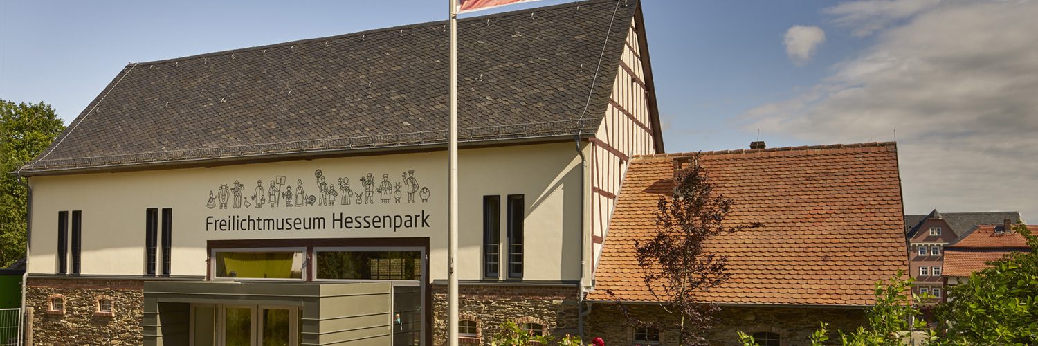 The barn with in-built horse stables and an added cowshed was part of a large farm estate. At its original location, this building completed a three-sided farmstead towards the garden. At first view, one notices the ground floor’s massive plinth wall of Taunus slate topped by a fine timber-framed construction. On the eaves side facing the farmyard is an awning that protected the stable doors and the massive barn doors from rain. The barn was altered a couple of times. A formerly solid outer wall was opened and fitted with doors to allow wagons to drive through the building. The cast-iron, triple-leaf yard gate was modelled after examples from the Neu-Anspach region.