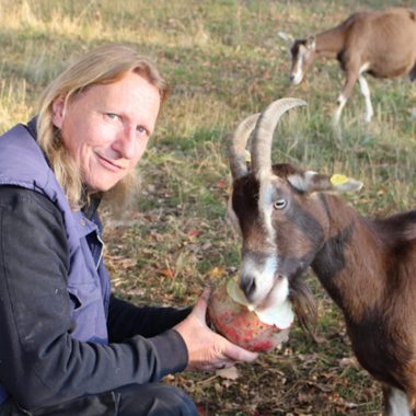 Cheflandwirt Volker Weber beim Ziegenfüttern