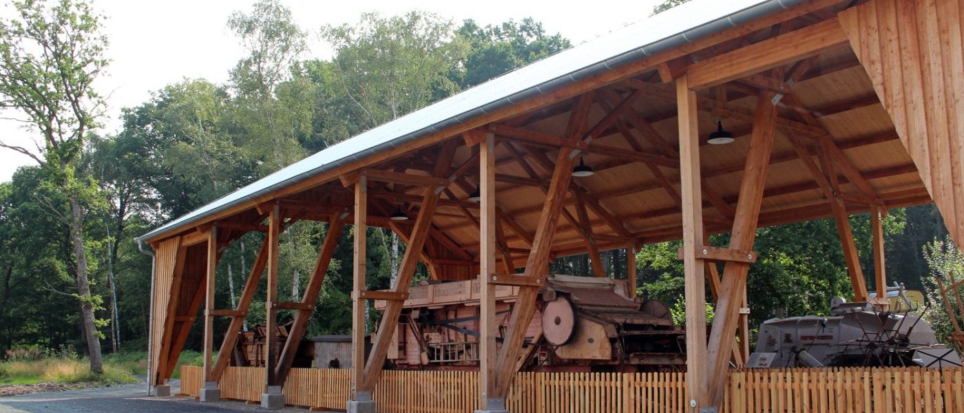 The threshing hall is accessible as well. It is used as a display depot for agricultural large-scale threshing machines and is home to the autumnal Thanksgiving celebration. A threshing machine and different drives throughout the years from the movable steam engine (locomobile) to the electric engine wagon drawn combine harvester to the self-propelled machine of the 1950s and 1960s are on display.