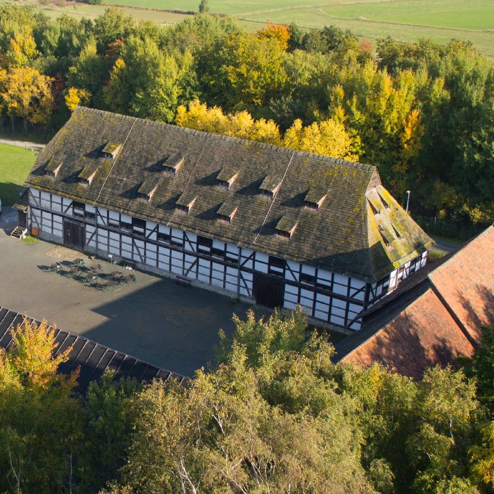 Luftaufnahme des historischen Fruchtspeichers aus Trendelburg, einem großen Fachwerkgebäude mit moosbewachsenem Dach, umgeben von herbstlich gefärbten Bäumen.