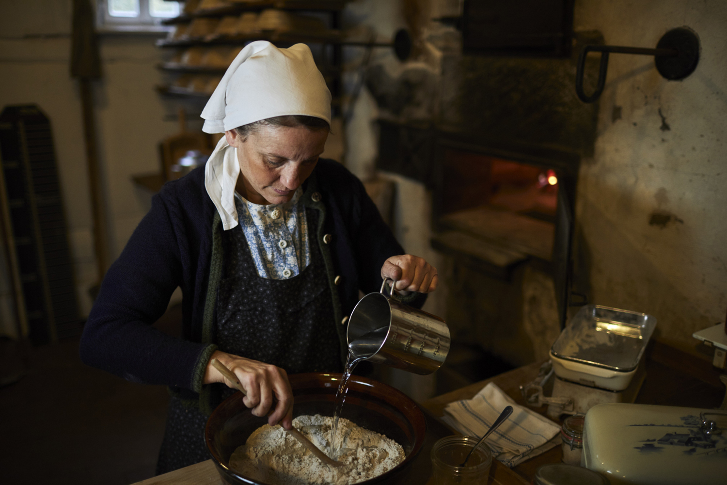 Unsere historische Hausfrau erfüllt die Baugruppe Mittelhessen mit wohlduftemdem Geruch. Im Backhaus aus Probbach bereitet sie deftigen Kuchen zu, der gekostet werden kann.