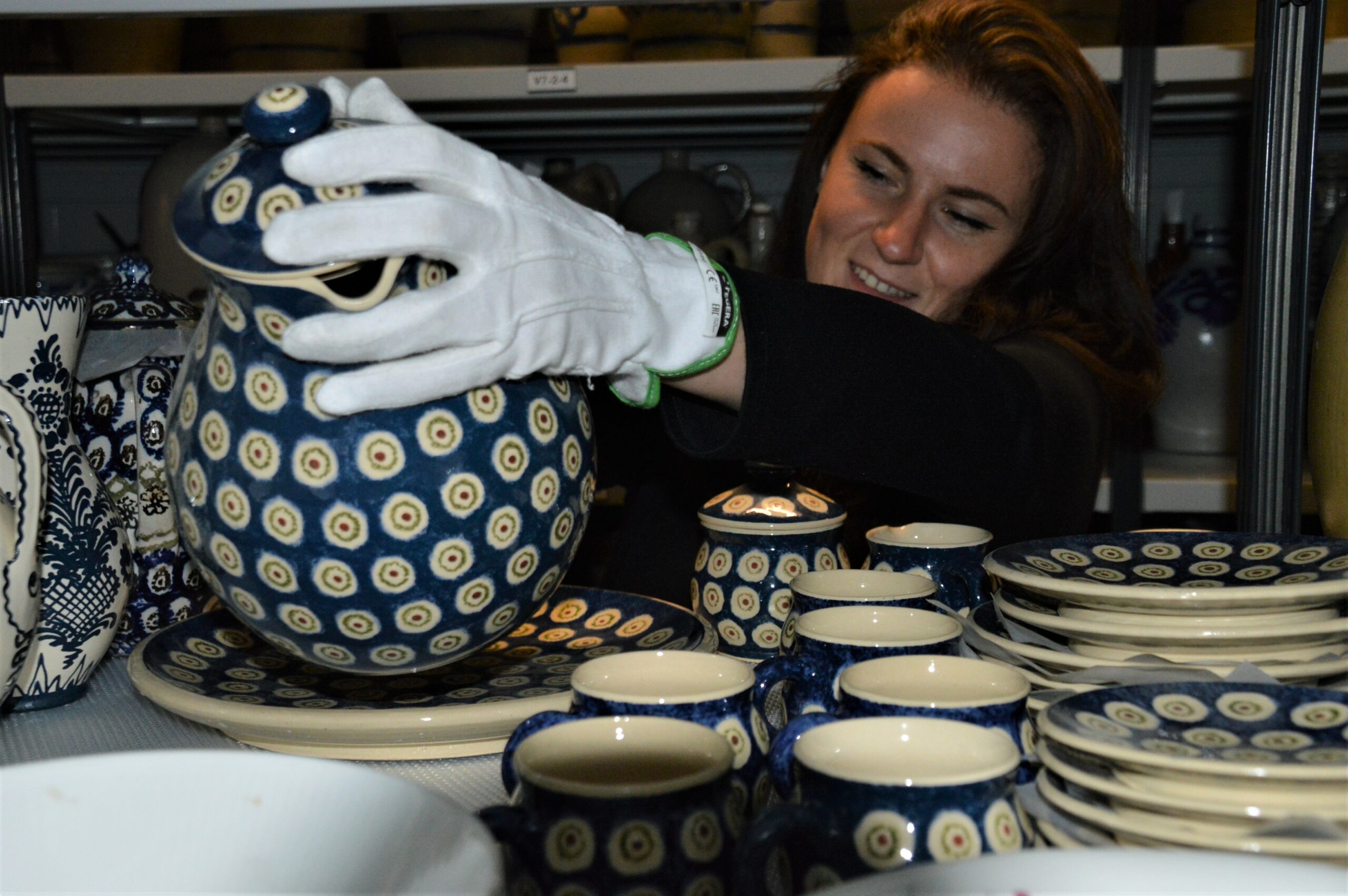 Museumsmitarbeiterin holt einen blauen Tontopf mit Punkten aus dem Regal.
