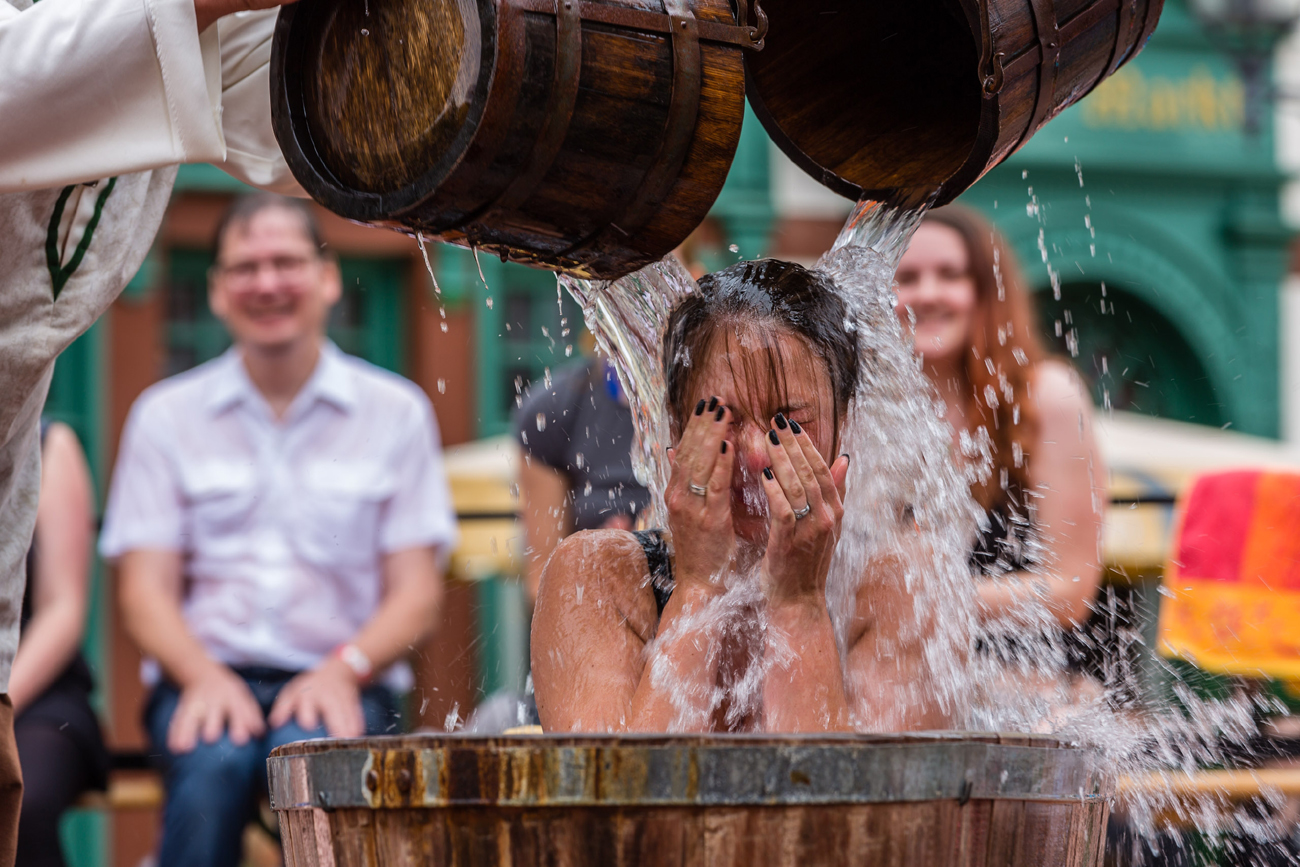 Auch in diesem Jahr unterziehen sich die Kornuten, so nennt man die angehenden Druckergesell*innen, dem traditionsreichen Brauch des „Gautschens“ auf dem Marktplatz des Freilichtmuseums.