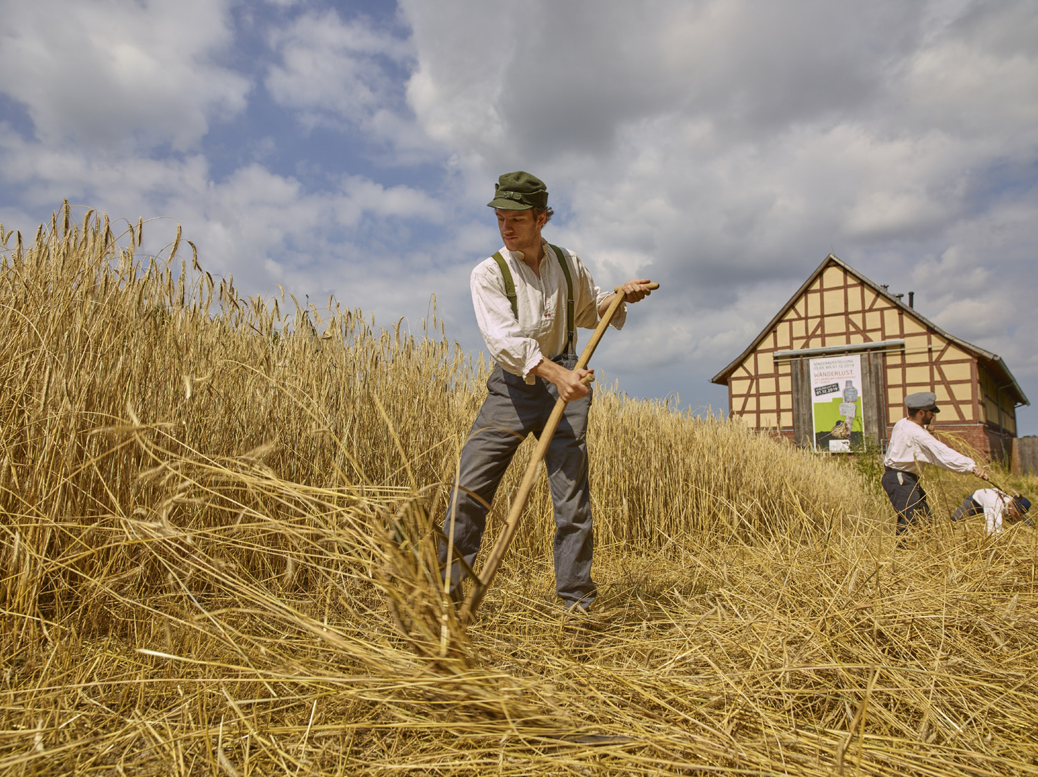 An diesem Wochenende dreht sich alles um die Ernte von Roggen, Weizen, Dinkel und Einkorn. Auf den Wölbäckern des Museums wird dem Getreide mit Sense, Sichel und Mähbinder zu Leibe gerückt. Schauspieler des Museumstheaters werden unter die Fittiche der erfahrenen Museumslandwirte genommen und lernen dabei die Arbeitstechniken und –schritte verschiedener Zeitepochen kennen. Zusätzlich gibt es bei guter Witterung Vorführungen mit historischen Mähdreschern. Auch die Kinder können auf den Feldern tätig werden und helfen, die Strohgarben einzusammeln. So erfahren sie, wie wichtig und schwer die Arbeit der Kinder auf den Feldern früher war.