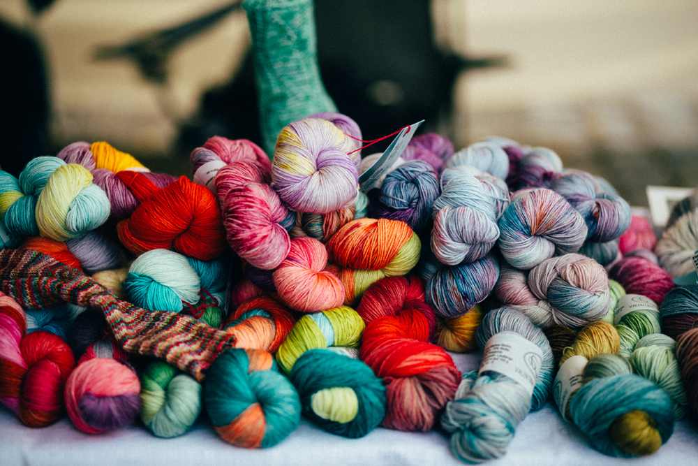 Aussteller*innen präsentieren mit einem breiten Sortiment an Stoffen, Knöpfen, Wolle, Filzwaren, Taschen, Tüchern und Schuhen.