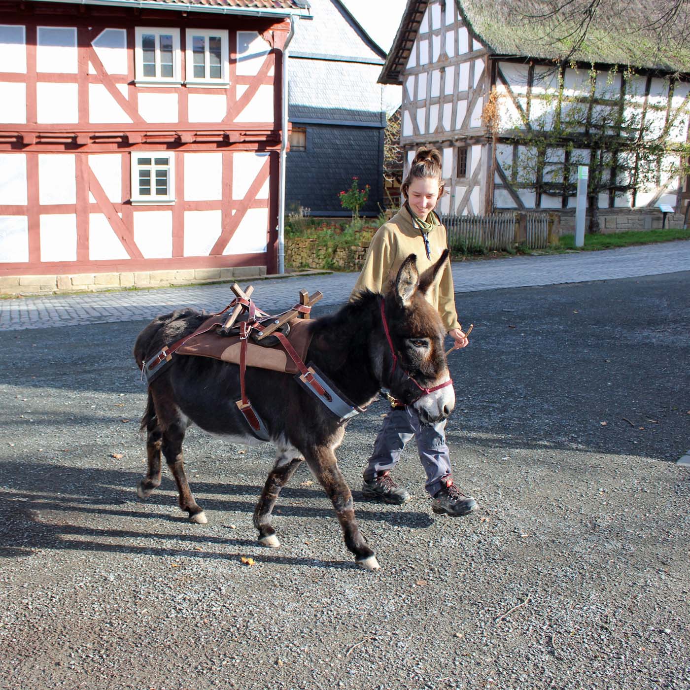 Damit unsere geliebten Esel regelmäßig beschäftigt sind und gefordert werden, widmet sich Annemarie Bank-Lauer den Huftieren. Gemeinsam sind sie zwischen der Bockwindmühle und dem Ziegenstall Fronhausen anzutreffen, wie sie Lasten durch das Gelände bewegen.