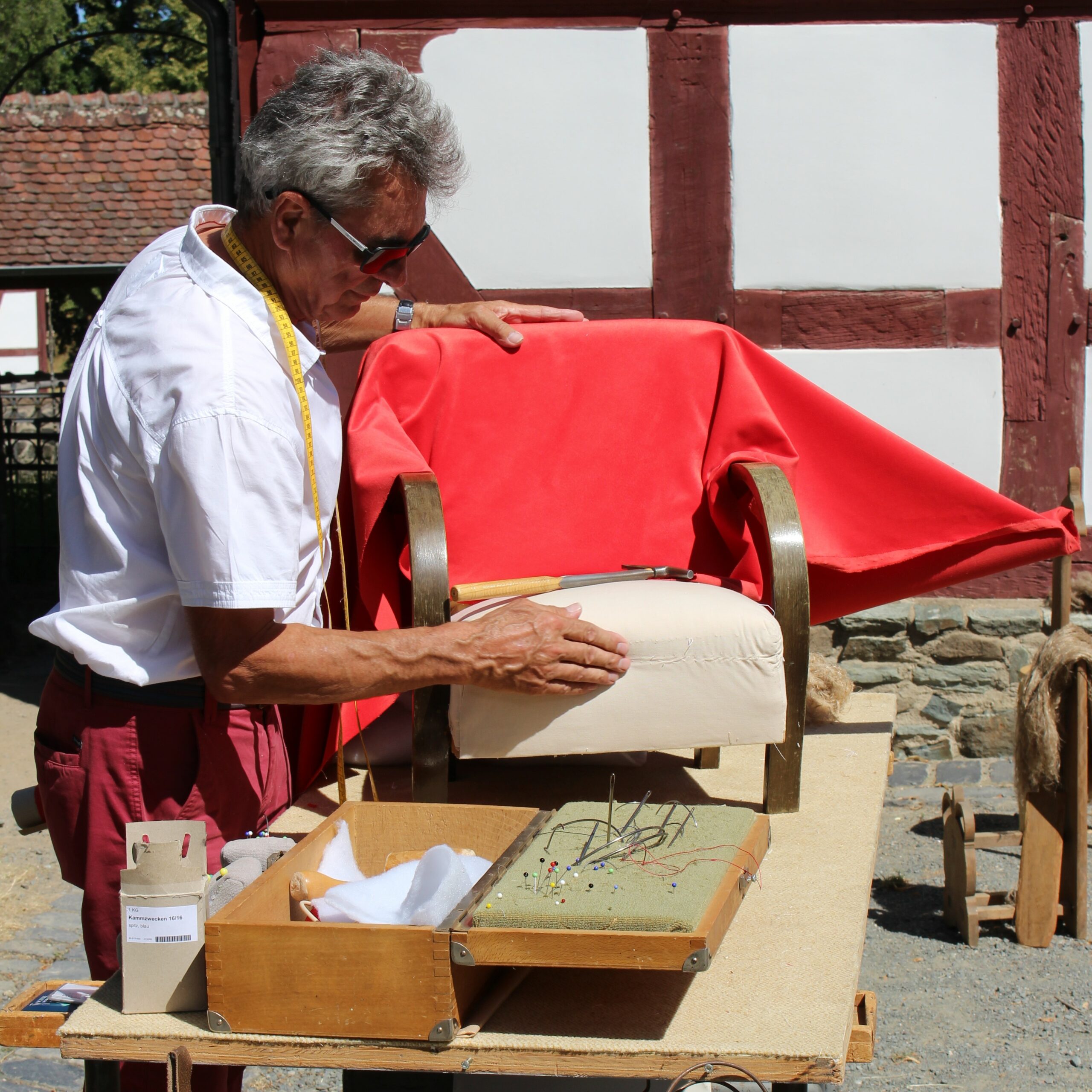 Die Herstellung von Polstermöbeln hat sich in den letztem 100 Jahren stark verändert. Bei dieser Vorführung kann man den traditionellen handwerklichen Prozess noch hautnah miterleben. Gezeigt wird der Aufbau der Polsterung eines Sitzmöbels bestehend aus Rosshaar, Palmblättern und grobem Flachs.