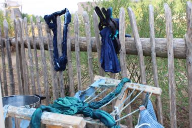 Die Esel werden an einen Packsattel gewöhnt. Aber das ist nicht die einzige Herausforderung. „Zu Beginn muss den Tieren erstmal klar gemacht werden, dass wir mit ihnen arbeiten wollen und nicht nur zum Füttern kommen“, erzählt Rebekka. Auch das Anlegen des Halfters benötigt Gewöhnung. Auf dem Foto ist Eseldame Maja zu sehen. Zwei Mal pro Woche wird ihr der Packsattel angelegt. Besonders wichtig ist Routine. Um stetige Fortschritte machen zu können, muss kontinuierlich trainiert werden. Im nächsten Schritt werden Gewichte an dem Packsattel befestigt, damit die Tiere auch die notwendige Muskulatur aufbauen können.