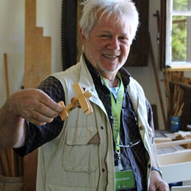 Ehrenamtlicher Schreiner hat ein kleines Holzflugzeug in der Hand, das aus einer Bastelaktion für Kinder stammt.