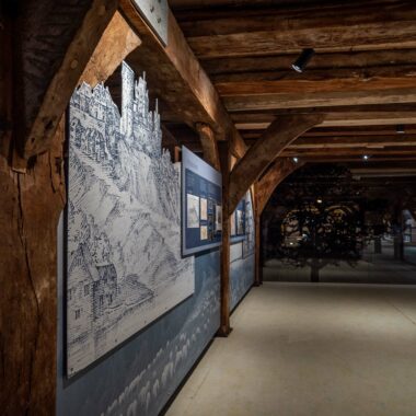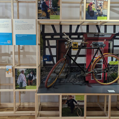 Ein ausgestelltes Retro-Fahrrad vor einem Foto von Fachwerkgebäuden, umgeben von Informationstafeln.