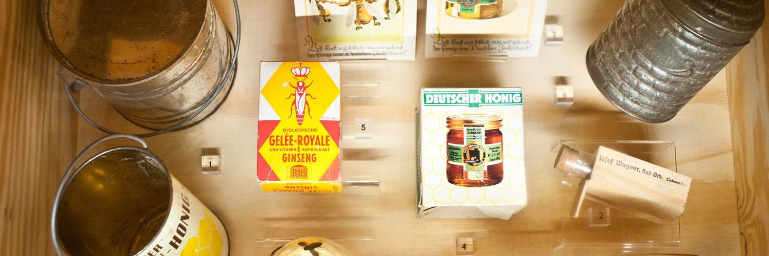 Den authentischen Rahmen für die Dauerausstellung zur Kulturgeschichte der Imkerei bildet das Bienenhaus aus Mammolshain. In dem schlichten Holzgebäude wird die Ausstellung in Form eines kleinen text- und bildunterstützten Schaudepots präsentiert. Thematisiert werden die Kulturgeschichte der Imkerei, die Geschichte des Hauses selbst und seines Imkers ebenso wie die Honigernte, die Geschäftstüchtigkeit der Imker und ein Beispiel für Nebenerwerbsimkerei aus dem hessischen Spessart. In einer Tischvitrine zeigen wir anhand von Kleingeräten die Königinnenzucht, die Wabenrähmchen-Herstellung, die Honigernte und den Honigverkauf. Mit fast durchweg aus Hessen stammenden Objekten wie Stülpern, Beuten und Honigschleudern sowie diversen kleineren Geräten wird die technische Entwicklung im Bereich der Imkerei erfahrbar.