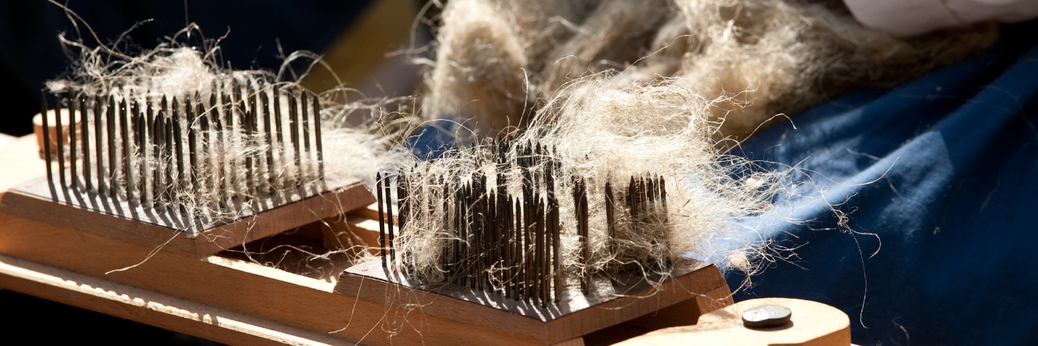 Eine Person zieht den Flachs über einen eisernen Kamm