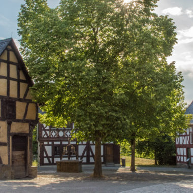 Dorfplatz in der Baugruppe Mittelhessen, man sieht einen Lindenbaum, die alte Schmiede aus Weinbach und die Kirche aus Niederhörlen.