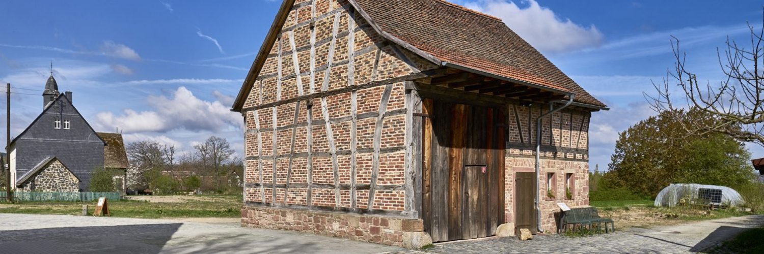 Die Fachwerkscheune aus dem südhessischen Altheim bildet zusammen mit der Scheune aus Mengerskirchen eine Scheunengasse, die den Marktplatz in Richtung Westen zur Baugruppe Mittelhessen hin abschließt. Die Konstruktion erscheint uneinheitlich: Während das Dachwerk in drei Zonen aufgeteilt ist, ergeben der wahrscheinlich später eingebaute steinerne Stall und die Tenne einen zweizonigen Grundriss. Die Ausfachung mit Ziegelsteinen erfolgte nach historischem Befund. Die Tür- und Fenstergewände im Stallbereich sind mit Entlastungsbögen aus Ziegelsteinen über einem Gewände aus Sandsteinen versehen. Der Besucherservice des Freilichtmuseums nutzt die kleine Scheune als Verwaltungs- und Lagergebäude.