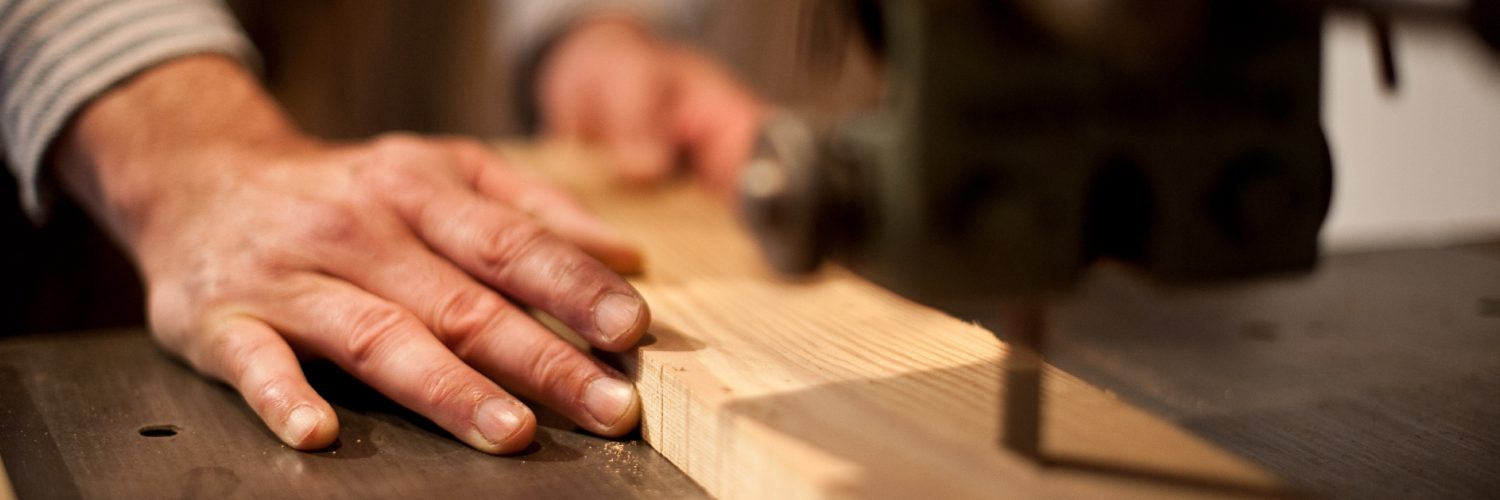 Innenaufnahme der Schreinerei aus Fulda: eine lange Werkbank und ein Regal mit Materialien