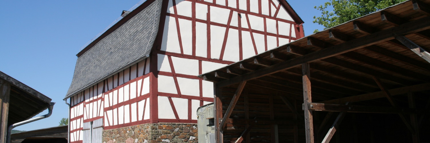 Die 1984 wiedererrichtete Stallscheune aus dem heutigen Landkreis Limburg-Weilburg zeigt die übliche dreizonige Einteilung in der Abfolge Stall, Tenne und Großviehstall, der die Hälfte des Gebäudegrundrisses einnimmt. Der hintere Teil des Stalls ist unterkellert und diente als Rübenlager. Die Scheune wurde laut Jahreszahl auf dem Türsturz 1830 als Wirtschaftsgebäude eines Zweiseithofes erbaut, wobei zahlreiche Balken von älteren Bauten Verwendung fanden. Das Fachwerkgerüst ruht auf einem Bruchsteinsockel und trägt ein Mansarddach – eher ungewöhnlich bei einem landwirtschaftlichen Gebäude, da diese Dachform meist auf herrschaftlichen und städtischen Remise Häusern vorkommt.  Der linke Giebel ist oberhalb des Mauersockels verschiefert und mit Dreieck und Sonnenmotiv verziert. 1891 wurde im Zuge einer größeren Reparatur in der rechten Stallzone eine preußische Kappendecke mit Stahlträgern eingezogen. Spätere Anbauten wie eine Hoftraufe mit Vordach und eine Jauchegrube mit Aborthäuschen wurden nicht mit übernommen.