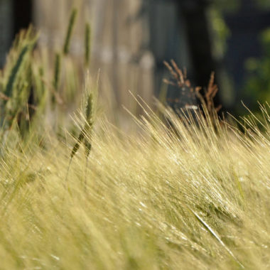Ein Feld mit reifem, goldgelbem Getreide im Sonnenlicht, unscharfer Hintergrund.